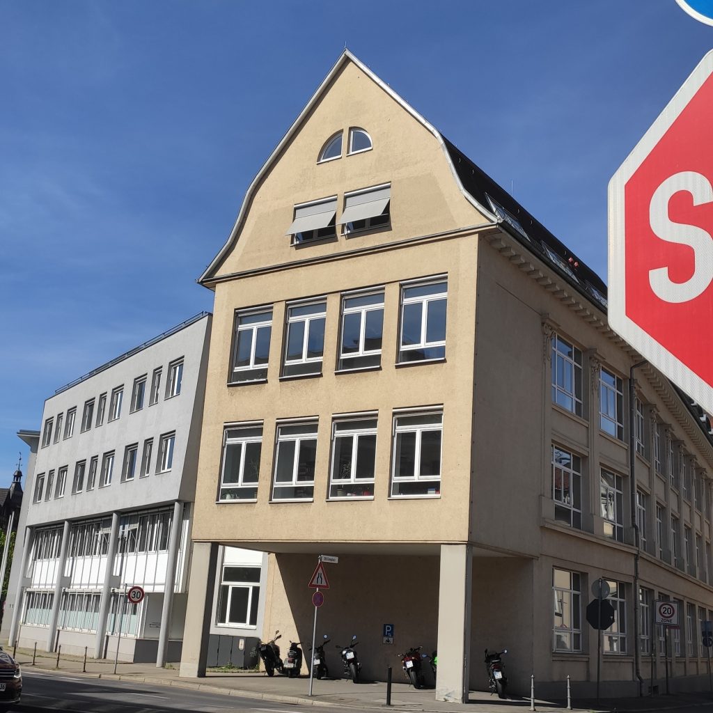 So auch in diesem Fall. Ich komme an dem Haus auf meinem Weg in die Stadt vorbei. Dabei sehe ich jedes Mal einen Frauenkopf vor mir. Die dunklen Haare ordentlich gekämmt und schön zu einem Mittelscheitel mit Außenwelle, wie es in den Sechzigern modern war, frisiert. Heute hat sie sich besonders herausgeputzt. Die herausgefahrenen Markisen lassen die Augen lasziv geschminkt erscheinen. Ihr Blick schaut somit besonders aufreizend auf die vorübergehenden Passanten hernieder. Mit diesem Augenaufschlag erinnert sie mich direkt an die stilisierten Hollywoodschönheiten aus eben jener Epoche. Sie ist ein wenig in die Jahre gekommen, hat um die Mitte zugelegt und steht, wie eh und je, auf ihren dünnen Beinchen. Etwas zu breitbeinig – das gehört sich gar nicht so recht für ein anständiges Mädel der hiesigen Innenstadt – und dabei beherbergt sie doch das ansässige Finanzamt.