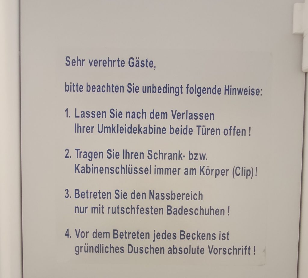 Neben dem allumfassenden Datenschutz gehören nun also der Brandschutz und die Unfallverhütungsvorschriften zu meinen täglichen Begleitern. Erschreckenderweise treffe ich neben dem beruflichen Kontext auch in meiner Freizeit immer häufiger auf Anweisungen, Paragraphen, Vorschriften. Zum Glück gibt es Instanzen, die mir sagen, wie ich meinen (Schwimmbad-)Kabinenschlüssel aufbewahren soll. Ich Depp hätte den glatt beim Plantschen einfach neben meiner Tasche liegen gelassen.