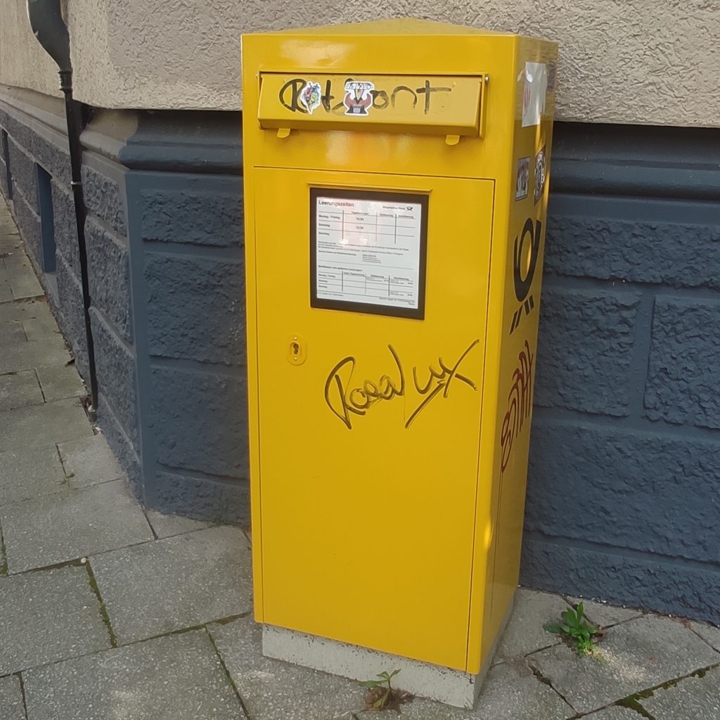 Fest gemauert in der Erde steht er da in Gelb markant und schluck sie alle runter, die Briefe, die noch geschrieben werden. Allerdings gerät auch dieses Relikt mehr und mehr in die Bredouille oder besser gesagt ins Hintertreffen. Das ist eine Gefahr für das handgeschriebene Wort. Oder für die originale Unterschrift, die noch nicht auf elektronischen Weg geleistet werden kann. Oder die Postkarte mit den idyllischen Ansichten von sonst wo her – die den Tourismus einfach ausradiert. Ein Ort für die gute und die schlechte Nachricht sowieso. Der gute alte Briefkasten ist nicht wählerisch, gibt keine Widerworte. Was könnte er wohl erzählen, ließe man dies zu. Er ist noch geduldig obwohl seine Pflege zunehmend nachlässt. Sonntags gibt es keine Leerung mehr. Und die Post, die wir dienstags erhalten (montags scheint es keine Post zugeben) ist somit Schnee von vorvorgestern.