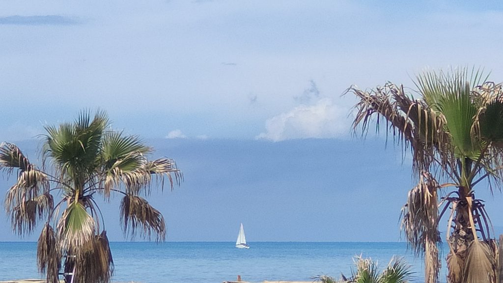 Wir schlendern unmotiviert da regentriefend durch die Gassen einer Altstadt, fahren weiter zur Küste auf der Suche nach einem Café und einer schönen Aussicht. Marina di Irgendwas entpuppt sich als langweiliger Bettenbunker mit null Charme, der durch die Tristesse des Wetters unvorteilhaft unterstrichen wird. Ein kleiner Strandspaziergang und die Sonne kämpft sich zwischen den Regenwolken hindurch. Der Blick, der sich mir dann bietet, könnte kaum karibischer sein. Was zwei Palmen, türkisblaues Wasser und ein weißes Segel sofort für Assoziationen hervorrufen – sämtlichen alkoholhaltigen Getränken sowie Schokoriegeln sei Dank.