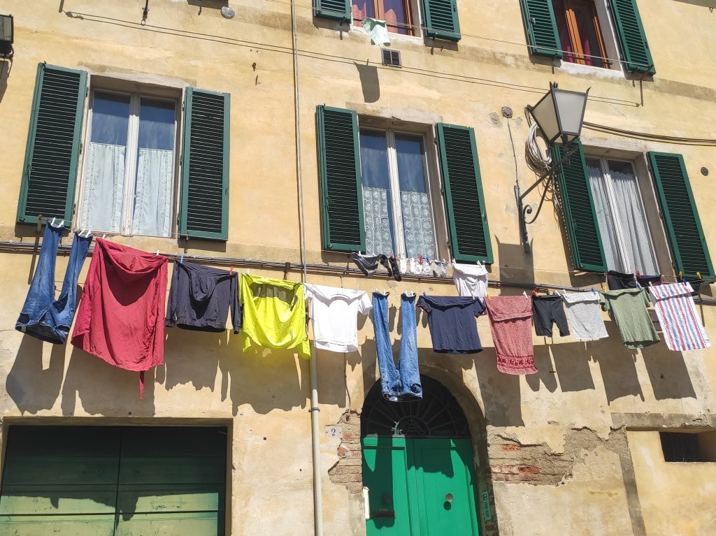 Ein paar Erfrischungen später, versuchen wir unseren Track wieder zu finden. Das ist, erfahrungsgemäß, keine einfache Angelegenheit und so geht es auch dieses Mal nicht ohne Umweg. Wir kennen das schon. Jedenfalls radeln wir auf diese Weise durch die unbesuchten Gassen der Stadt, die einen Marktplatz in Muschelform hat. Die Wäsche, nehme ich zu Kenntnis, wird praktischer Weise an der Hauswand in der Sonne getrocknet. Mir gefällt das Crossover aus antikem Bauwerk und modernen Zeiten – obwohl, das war sicherlich schon immer so.