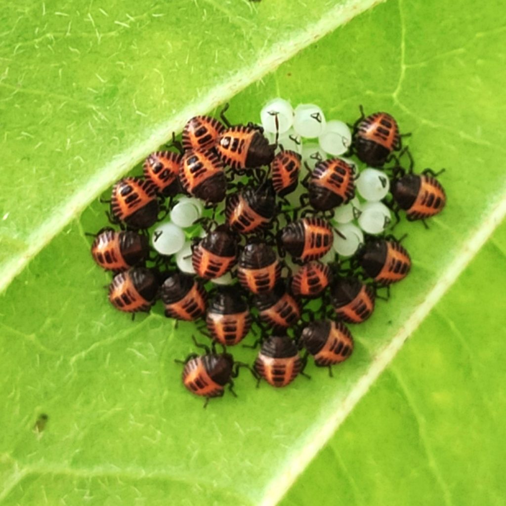 Ich beschäftige mich damit, ob die kleinen Käfer, die, so hat es den Anschein, gerade aus dem Ei geschlüpft, Freund oder Feind sind. Vom Wohnzimmer aus sehe ich sie an der Blattunterseite meines Hartriegels kleben. Sie sind winzig klein. Höchstens einen halben Millimeter groß. Ich habe sie noch nie gesehen. Sind das junge Feuerwanzen? Sehen irgendwie anders aus. Ich probiere mich durch alle möglichen Flora und Fauna Apps durch, doch Fehlanzeige. Die Tierchen finde ich nicht. Fraßspuren kann ich auch keine erkennen. Ich beschließe die Entwicklung zu beobachten. Bleibt mir sowieso nichts Anderes übrig. Krassere Mittel möchte ich nicht einsetzen.