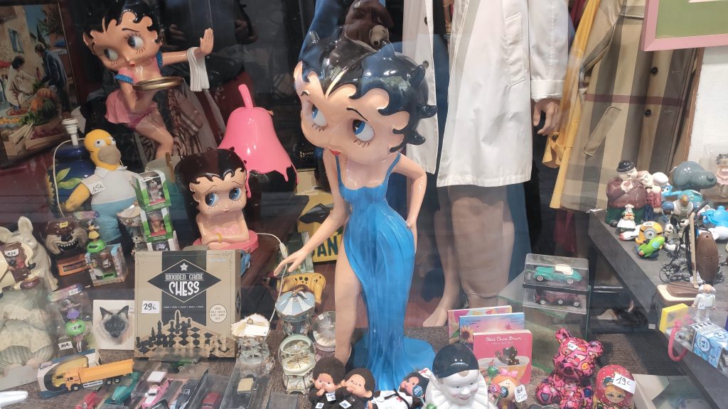 Das Foto zeigt das Schaufenster eines Trödlers, der liebevoll nach Thema seine Ware sortiert hat. In einem Schaufenster gibt es unterschiedlichste Versionen von Buddha oder Heiligenfiguren zu betrachten. Daneben sehe ich das Michelin-Männchen mit kleinem Kopf und übergroßem Körper ebenfalls in diversen Ausführungen dekoriert. Oder, wie auf meinem Bild, Puppen, diverse Straßenkreuzer in Miniformat und Spielfiguren wie Monchichies, Homer Simpson oder die Minions. Leider habe ich keine Ahnung, wie die Frauenfigur mit den übergroßen Kulleraugen heißt. Ob sie überhaupt einen Namen hat? Wahrscheinlich schon, denn es gibt mehrere Ausführungen von ihr.