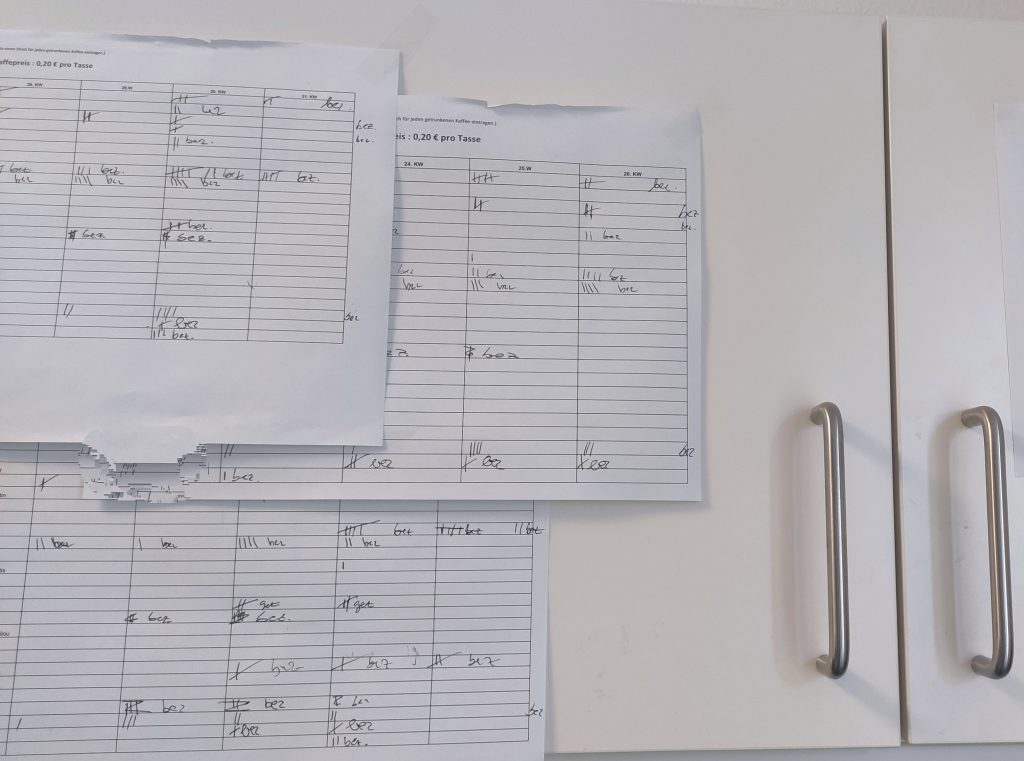 Darüber hinaus ist ihre unprätentiöse Art, gepaart mit reduzierter Aufdringlichkeit in der Lage, sich vor allzu penetranter Verfolgung zu verbergen. Zurückhaltend, ja geradezu angepasst wie ein Chamäleon, hängt sie, wie in diesem Beispiel, missachtet an den Schranktüren in der Büroküche. Trotz ständiger Präsenz entzieht sie sich geschickt den Blicken derjenigen, die ihre Zechen nicht Zahlen und die wenigen Groschen, die für ihren Kaffeegenuss fällig werden, geflissentlich ignorieren.