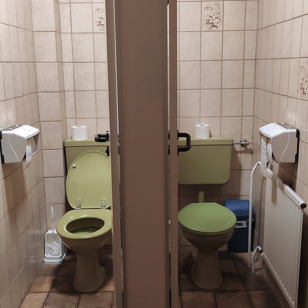 Als ich die Tür öffne finde ich mich in einem Traum aus braun-beige-grün wieder. „Wie zuhause“, sind die ersten Gedanken, die mir beim Anblick der beigen Kacheln in den Sinn kommen. Ich bin in die Vergangenheit gereist. Der Türrahmen muss ein geheimes Zeitportal sein. Die knallgrünen Kloschüsseln schauen mir erwartungsvoll entgegen. Der dunkelbraungefleckte Fliesenboden… – ich lächle bei dem Augenschmaus – das kenne ich alles. Selbst die eingestreuten Blümchenfliesen sind authentisch und mein Lächeln wird breiter.