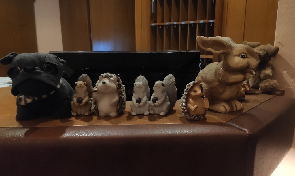 Dabei fällt mir das Foto mit den Tierfiguren in die Finger. Den Anblick der Hund-, Eichhörnchen-, Igel-, Hase-, Teddybären-Versammlung auf dem Empfangstresen eines Hotels finde ich umwerfend. Umwerfend schön. Ich bekomme gleich gute Laune. Daran hat sich nichts geändert.