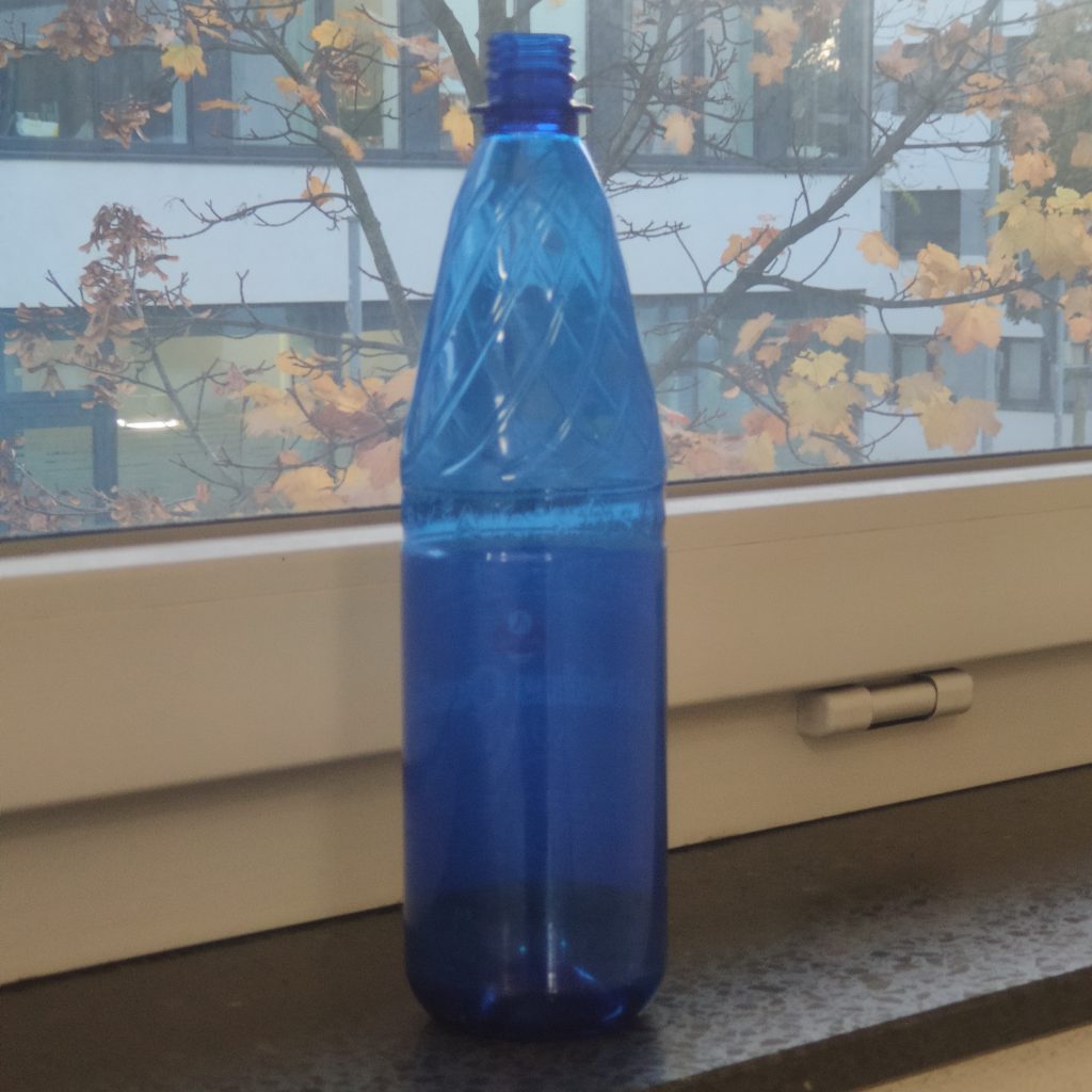 Anstatt den Aufzug zu nehmen, nehme ich die Treppe in einem Bürogebäude. Ich bin fast unten angelangt, entdecke ich auf halber Höhe des Treppenabsatzes eine Flasche auf dem Fenstersims. Augenscheinlich knalle blau ist sie, wie ihr seht. Was macht die denn hier? Wurde sie absichtlich dort abgestellt, um von ihrer Last befreit zu sein? Oder wird sie am Ende jetzt gerade schmerzlich vermisst? Beides ist möglich. Einfach abgestellt? Oder vergessen? Das kann ich nicht beurteilen. Was ich jedoch weiß ist, dass ich mich ebenfalls manchmal abgestellt fühle. Ich glaube, das Gefühl nicht beachtet zu werden, kennen wir alle.
