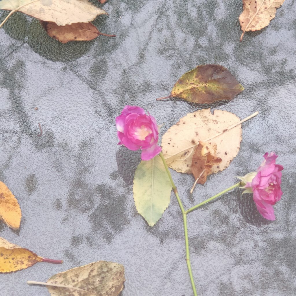 Nachdem gestern die Hecke dran war, rücke ich heute den Rosen zu Leibe. Ein moderater Rückschnitt bereits im Herbst hat sich als unkritisch erwiesen. Auf diese Weise kann ich der Wucherung ein wenig Einhalt gebieten und habe im Frühjahr weniger zu tun. Als ich die langen Stängel klein schneide, stelle ich überrascht fest, dass es noch zwei kleine Blüten gibt, die dem Jahresende entgegen trotzen. Das ist mir vorhin gar nicht aufgefallen. Sie haben sich wohl versteckt. Ich rette die Blüten vor der Tonne und stecke sie in eine kleine Vase. Dort stehen sie nun auf dem Couchtisch und ich kann sie mir eine Weile anschauen. Wenn der Strauch im Mai wieder blüht, dann sind sie viel größer und violett und nicht rosa. Aber das dauert noch.