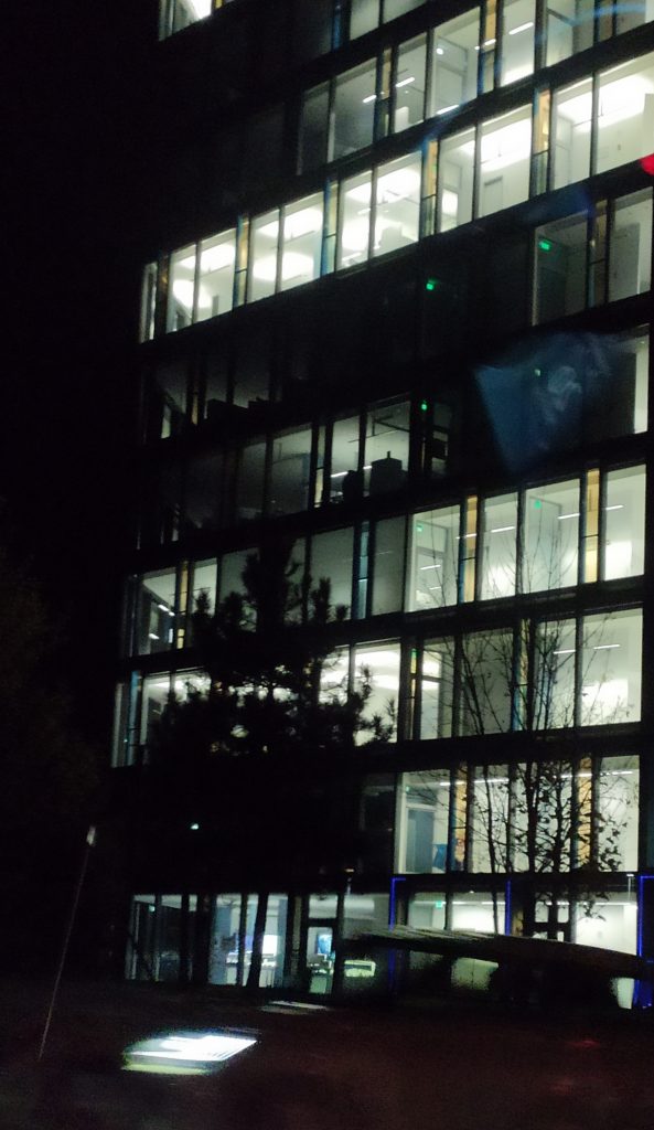 Die Dunkelheit bringt es ans Licht: inside out. Dass, was sonst unsichtbar schlummert, wird durch die Umkehr von Helligkeit und Dunkelheit sichtbar. Plötzlich bekomme ich völlig neue Einblicke. An helleren Tagen kann ich das Innere der Gebäude nur erahnen. Die Spiegelung der Fensterfront lässt keine Einblicke zu. Jetzt, in der dunklen Jahreszeit, kehrt sich das um und ich erhasche meinerseits einen kurzen Blick. In der so und so vielten Etage sehe ich im Vorbeifahren einen Mann, der in dunkler Hose, weißem Hemd und Krawatte ohne Jackett um einen Schreitisch läuft.