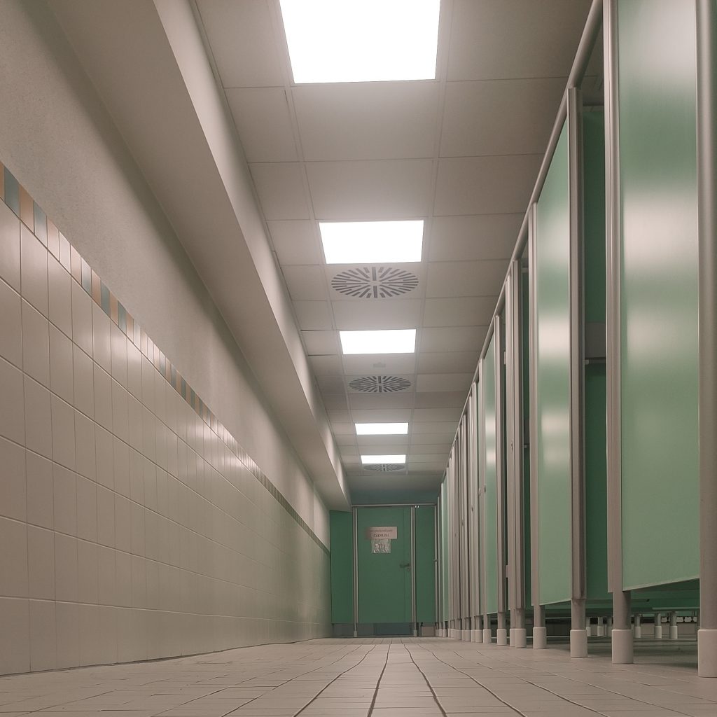 Das Schwimmtraining ist beendet. Ich verlasse die Umkleide und stelle mich unter den Fön. Mein Blick schweift den Gang entlang und findet sich in grün-weißen Fliesen, grünen Kabinentüren wieder. Der Fön erinnert mich an eine Autowaschanlage. Ähnlich laut und mindestens genauso heftig bläst er mir mäßig warmen Wind um die Ohren. Ich stelle mir vor, wie er die winzigen Wassertropfen wie auf einer Windschutzscheibe nach links und rechts schleudert. Dabei versuche ich meine Haare soweit zu bändigen, dass sie mir hinterher nicht komplett vom Kopf abstehen. Klassischer Fall von Verschlimmbesserung denke ich, während ich den Kopf hin und her bewege und mich einmal um die eigene Achse drehe. Nach dem Fönballett packe ich meine Tasche und Jacke und gehe erledigt in Richtung Treppe und Ausgang. Mein Magen knurrt und verlangt nach einem kleinen Nachschlag vom Abendessen.