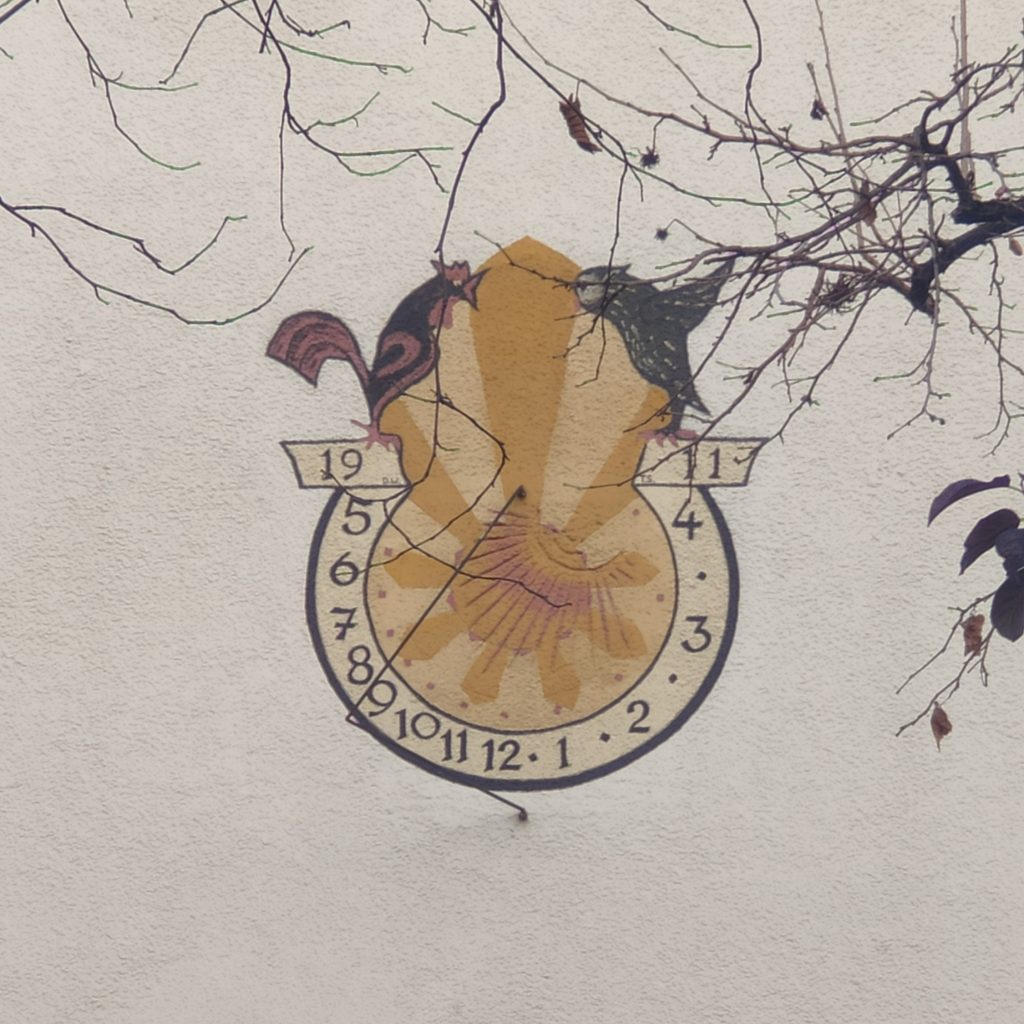 Das alte Haus an der Straßenecke, in dem seine Praxis ist, ist schon immer mit einer Sonnenuhr bemalt. Leider gibt es heute nichts zu sehen. Die Sonne lässt sich nicht blicken. Bei der aktuellen Winterzeit wird sie im Moment wahrscheinlich richtig gehen. Ich schaue mir die Uhr genauer an und erkenne, dass sich Hahn und Eule offenbar streitend gegenüberstehen. Da hat sich jemand was dabei gedacht. Der uralte Zwist über die Vorzüge beider Tageszeiten wird wohl nie aus der Mode kommen.