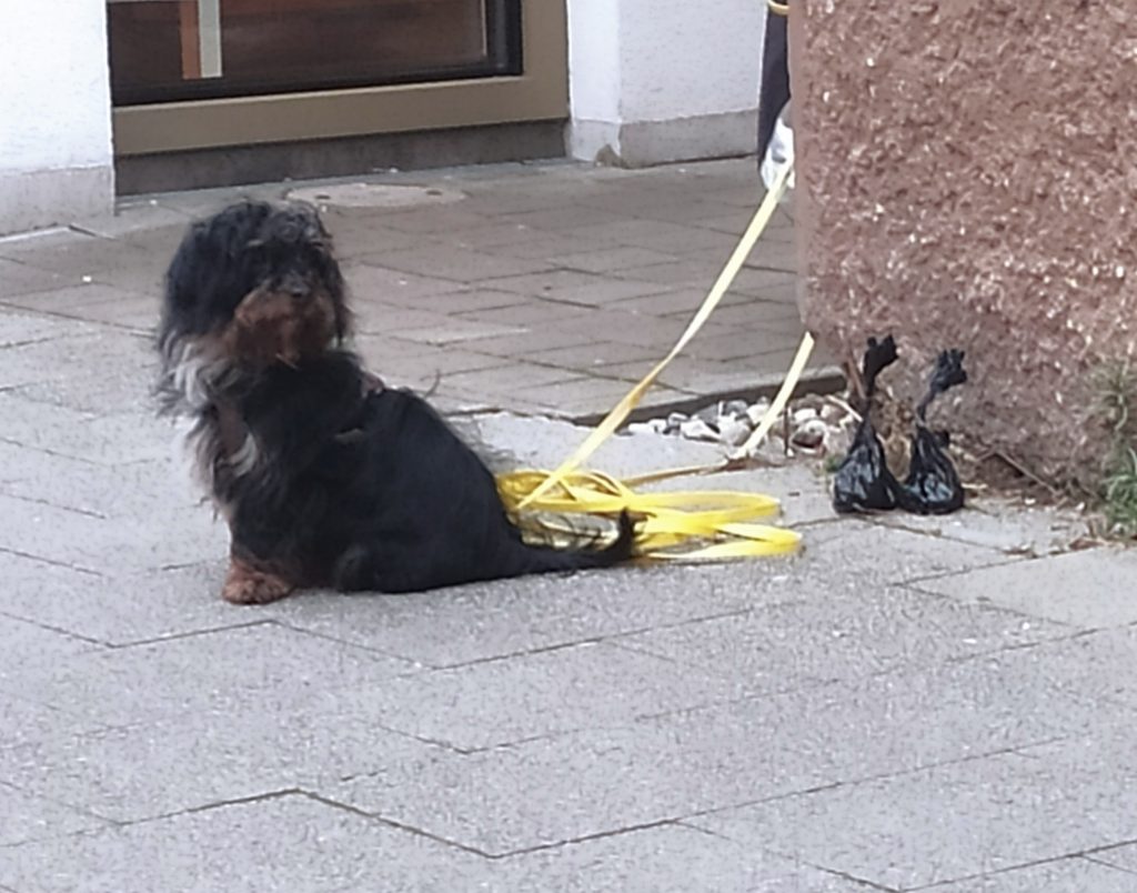 Dabei fällt mir auf, dass er offensichtlich eine wichtige Mission erfüllt. Seine Mission heißt: Wache schieben und aufpassen, dass den beiden, fein säuberlich nehmen ihm abgelegten, Kackbeuteln vom Morgengassi nichts passiert. Werden wohl seine eigenen sein, nehme ich an. Bei dieser Beobachtung halte ich spontan inne und überlege mir, wie ein solch kleiner Kerl gleich zwei am Morgen vollbekommt. Noch mit dieser Fragestellung beschäftigt, schließt sich eine weitere an. Was, so frage ich mich, passiert, wenn die Hundebesitzerin aus der Bäckerei zurückkommt?