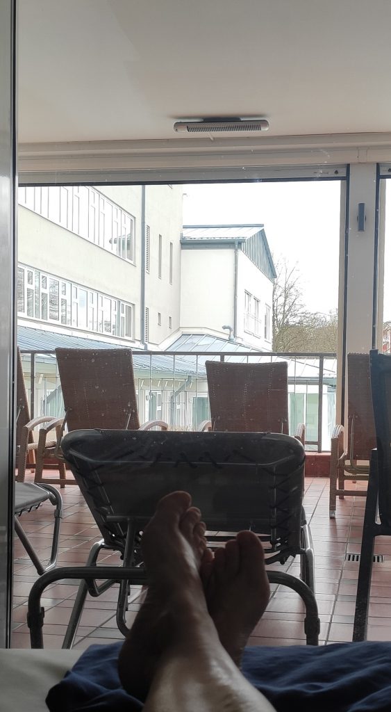 Ich stehe lässig unter der Massagedüse und beobachte das Geschehen, während mir der warme Wasserstrahl den Nacken massiert. Lauter kleine Köpfe mit bunten oder sehr wenigen Haaren, lustigen Schirm- u. Filzmützen, Neoprenbadekappen umzingeln mich und eine Baskenmütze ist auch dabei. Wobei ich mich frage, warum Baskenmütze? Ja, ja, da gibt es so einiges zu bedenken, denke ich mir, wenn man in die Therme geht. Gleich reihe ich mich in die Schlage an der Massagedüse ein. Ein Gong lässt keine Unstimmigkeiten hinsichtlich der Verweildauer bei den Badegästen aufkommen. Bei jedem Schlag wird einfach immer eine Station streng in Pfeilrichtung (!) weiter ‚gewellnessed‘.
