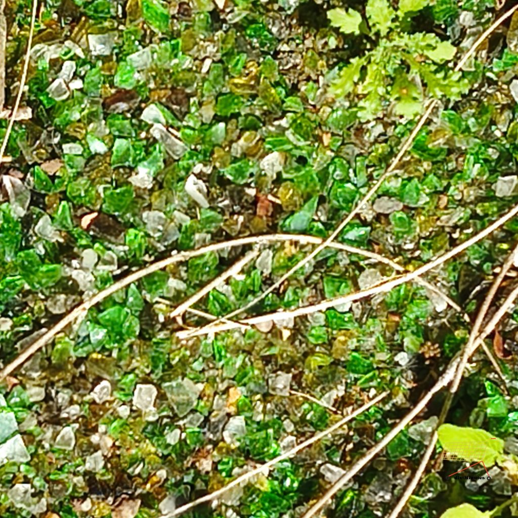Im Vorbeilaufen fällt mein Blick auf die grünen und weißen Glasscherben. Diese liegen rund um die Baumbepflanzung als Bodenbelag auf einer schwarzen Plastikfolie verteilt zwischen den Büschen, die ansonsten dort wachsen. Warum sie dort liegen, habe ich mich des Öfteren gefragt. Warum werden Glasscherben rund um die Bäume verteilt? Habt ihr sowas schon mal gesehen? Ich kennen das nur an diesem Gebäude und es ist offensichtlich bewusst so angelegt. Vielleicht als Bodenbelag zur Hundeabwehr? Oder damit niemand auf die Folie tritt? Merkwürdig. Sehr merkwürdig. Durch meine Brille leuchtet ihre weiße und grüne Färbung besonders hell. Reflektionen des Sonnenlichts verstärken den Effekt um ein Vielfaches.