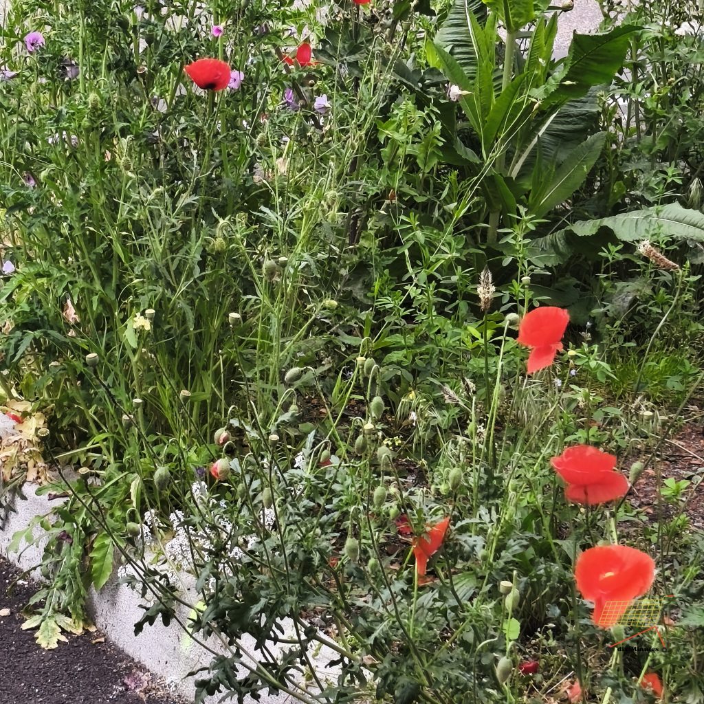 Da es bei uns keine festen Parkplätze gibt, ist der Feierabend oft mit der Suche nach einer geeigneten Fahrzeugabstellmöglichkeit verbunden. Dieser Umstand, stelle ich heute fest, birgt einen kleinen Schatz. Er verschafft mir nämlich ständig neue Perspektiven auf die Umgebung meines Zuhauses. Ich nehme also heute einen anderen Weg als gestern, als letzte Woche und stelle eine Veränderung fest. Ich kann sie nicht ganz einordnen. Es sieht anders aus. Es blüht im schönsten Klatschmohnrot zwischen Autos, Fußweg und Straße. Sofort mache ich einen Schnappschuss der Pracht.