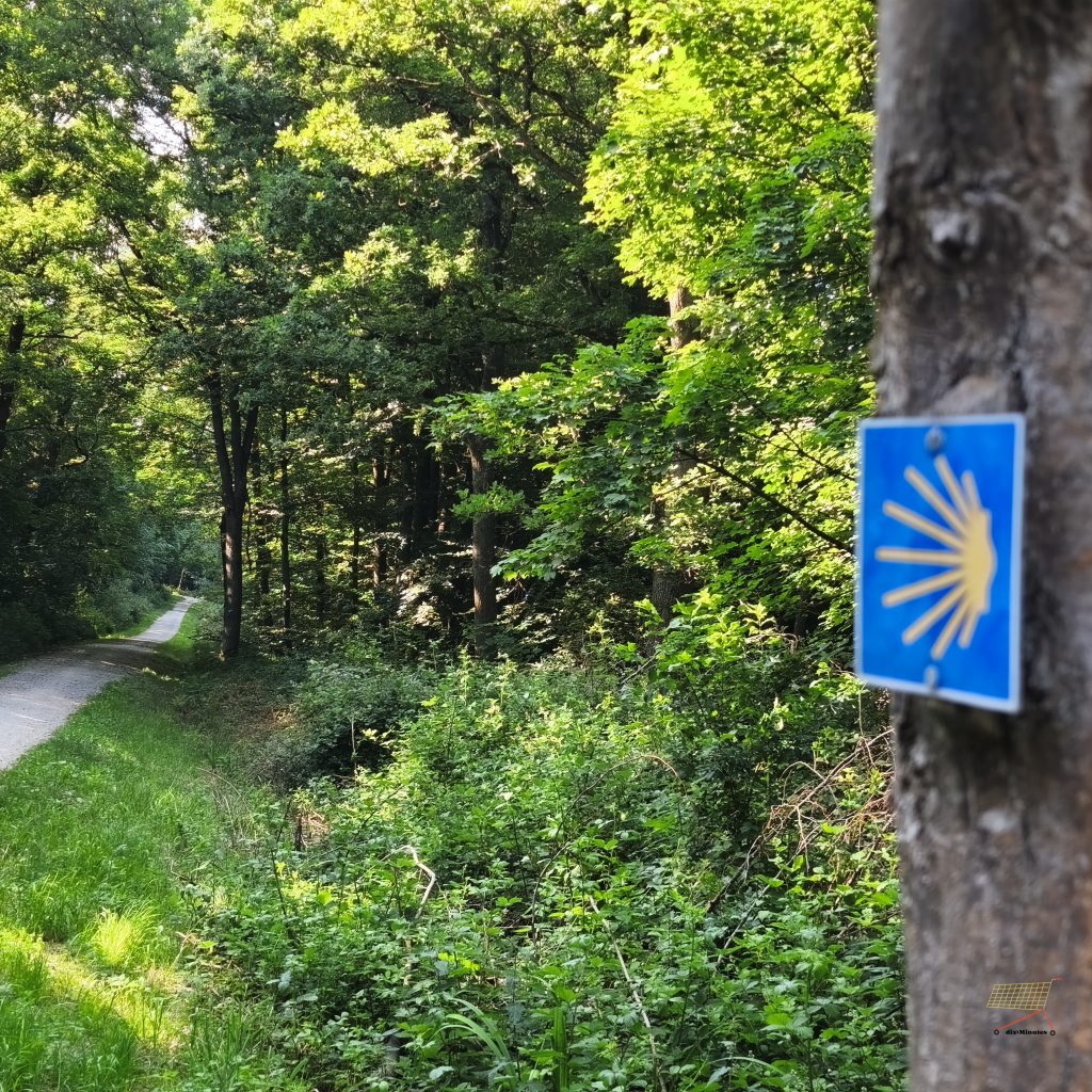 Oben angekommen halte ich an, trinke einen Schluck und mache den Schnappschuss von der Jakobsweg-Muschel. Da fühle ich mich gleich gut behütet, schließlich bin ich ausnahmsweise ohne die andere Hälfte meines Haushalts unterwegs.