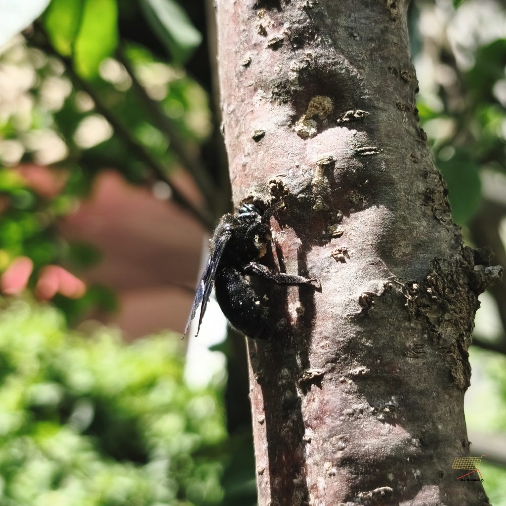 Die Marille hat ein paar tote Äste, die schon häufiger von Holzbienen in Beschlag genommen wurden. Ich stehe also auf, gehe die Stufen in den Garten runter. Tatsächlich. In knapp zwei Meter Höhe, beißen sich ihre starken Kiefer ins Holz. Ich schaue ihr zu, wie sie sich mit dem Holz abmüht. Es macht Geräusche, wenn sie nagt. Wie beim Schreiner, liegen Sägespäne unter ihrem Loch auf den Blättern. Auch sie ist über und über damit bedeckt. Wer will fleißige Handwerker sehen?, das alte Kinderlied, geht mir spontan durch den Kopf.