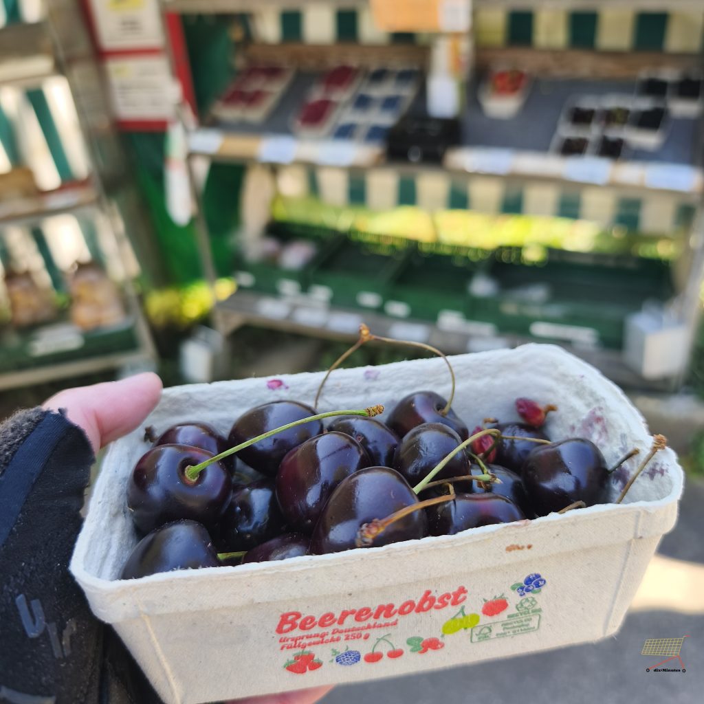 Ich habe eine Idee. Am Ortsausgang des nächsten Dorfs gibt es eine „Obst- und Gemüse-Tankstelle“, da werde ich schauen, was es gibt. Äpfel, Beeren, Kartoffeln, Frühlingszwiebeln, Radieschen lasse ich liegen und nehme mir ein Schälchen Kirschen. Stecke das Geld ins dafür vorgesehene Kästchen und rolle in den Schatten, snacke sie der Reihe nach weg. Lecker. Saftig und süß geben sie mir genügend Power für die letzten Kilometer.