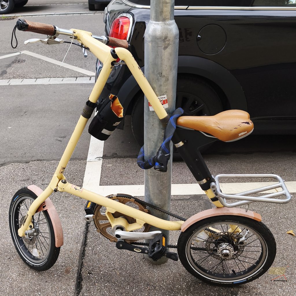 Ich steige aus meinem Fahrzeug, gehe auf die andere Seite und hole Laptoptasche, Handtasche, Einkaufsbeutel mit dem Brot vom Bäcker, Regenschirm vom Beifahrersitzt. Dabei fällt mir ein Fahrrad auf – ist es überhaupt eins?, das hier, angeschlossen an den Straßenlaternenpfahl, steht. Wie sieht das denn aus? So eine ungewöhnliche Konstruktion habe ich noch nie gesehen.