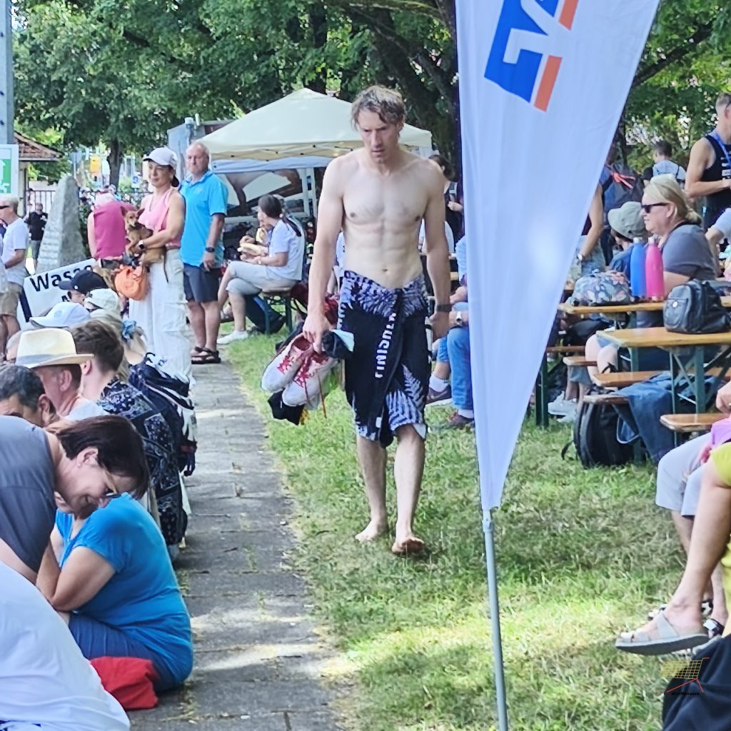 Wieder ein Wettkampfsonntag. Dieses Mal mit sehr prominenter Besetzung. Es ist toll, wenn ein Herzblutsportler wie Sebi Kiendings sich so nahbar gibt. Sich locker am Schwimmstart zu den anderen Teilnehmenden gesellt, mit dem Moderator quatscht und allen, die über die Olympische Distanz ins Wasser gehen, viel Glück wünscht. Er selber startet als Staffelteilnehmer, muss also nur schwimmen, wie er kundtut. (Das ist der Grund für meinen späteren Schnappschuss – Anm. der Redaktion).