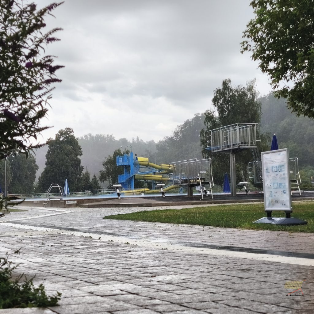 Wir sind im Plan (#573 weggefegt). Die andere Hälfte meines Haushalts und ich kommen gerade aus dem Fitnessstudio. Ich vom Laufband und er vom Kraft- und Balancetraining. Hier, im Freibad werden wir ausgebremst. Aus Sicherheitsgründen hat der Bademeister alle Schwimmer aus dem Becken geholt. Ein Gewitter zieht in der Nähe vorbei. Jetzt heißt es abwarten, bis es sich verzogen hat. Als der Himmel aufreißt, geht es für mich zu einer kleinen Schwimmeinheit ins Wasser. Eintausend Meter. Das ist überschaubar. Da außer uns nur wenige Badegäste da sind, haben wir die Bahn fast für uns. Ein unbestrittener Vorteil bei Regenwetter.