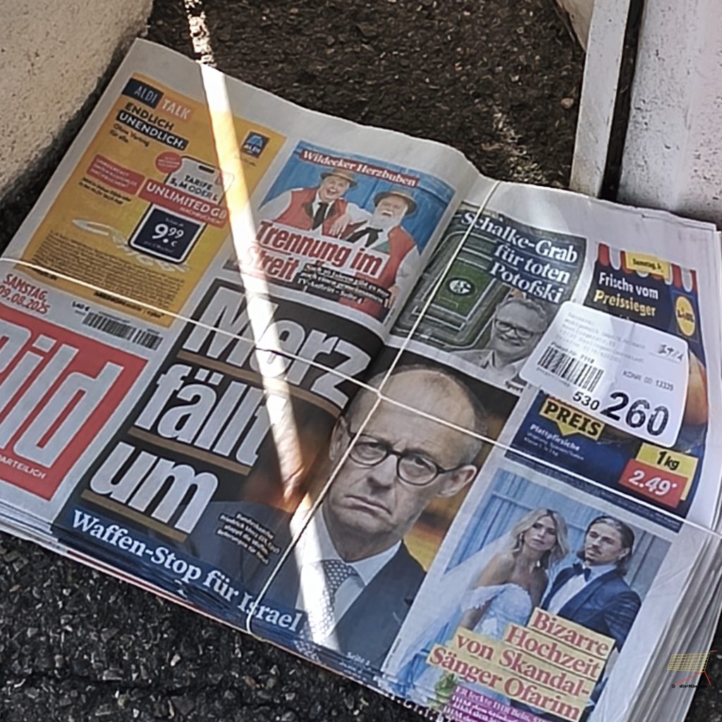 Gestern Abend sind mir auf dem Heimweg eine Fülle von Kuriositäten über den Weg gelaufen. Oder besser gesagt, bin ich an einer Fülle von Kuriositäten vorbeigekommen. Darunter dieser Stapel Zeitungen (‚kurios‘ bezieht sich in diesem Fall auf den Inhalt), der, gut verschnürt, neben dem Eingang einer Bäckerei liegt. Offenbar war die Nachfrage zu gering, als dass er gebraucht worden wäre. Wer will den Schrott auch schon lesen, der in diesem Blättchen täglich verzapft wird?