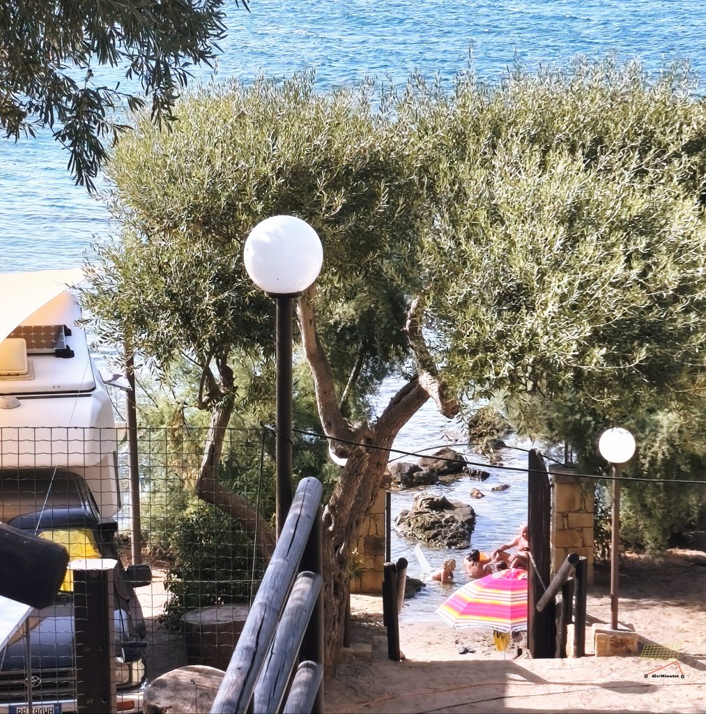 Terrassenförmig angelegt, schlängelt sich unser Campingplatz bis runter ans Meer. Die kleine Bucht, die wir über ein paar Treppen schnell von unserem Platz aus erreichen, ist teilweise felsig, mit Kieselsteinen und feinem Sand versehen. Das Wasser ist traumhaft klar. Kleine Fische schwimmen um unsere Füße.