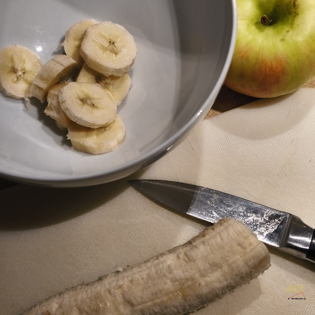 Beim Schneiden der Banane überlege ich, wie viele Scheiben ich hier abschneiden kann und beginne zu zählen. Es sind bei dieser sechsundzwanzig, falls ihr euch fragt. Bestimmt nicht, kann ich mir vorstellen, schließlich ist es überflüssig, sowas zu zählen.