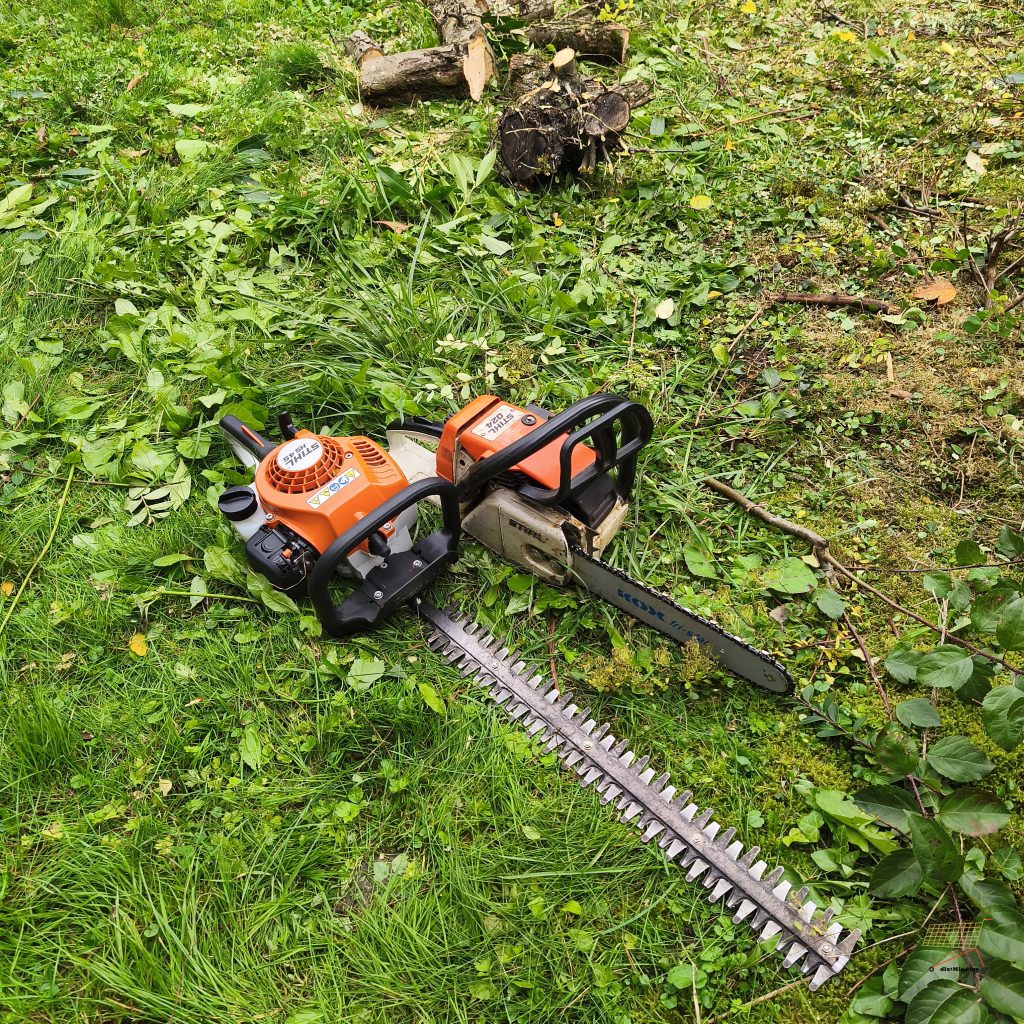 Wir mit unserer kleinen, billigen Heckenschere dürfen heute nicht dabei sein. Heute kommt richtiges Gerät zum Einsatz. Rucki zucki, vom Profi geführt, sind die Arbeiten schnell erledigt. Wir beide fungieren als Handlanger und Hilfsarbeiterin für Motorsäge und Co. Ich reche zusammen, fege und gehe schließlich meiner Kernkompetenz, dem Rasenmähen, nach. Dann ist alles erledigt.
