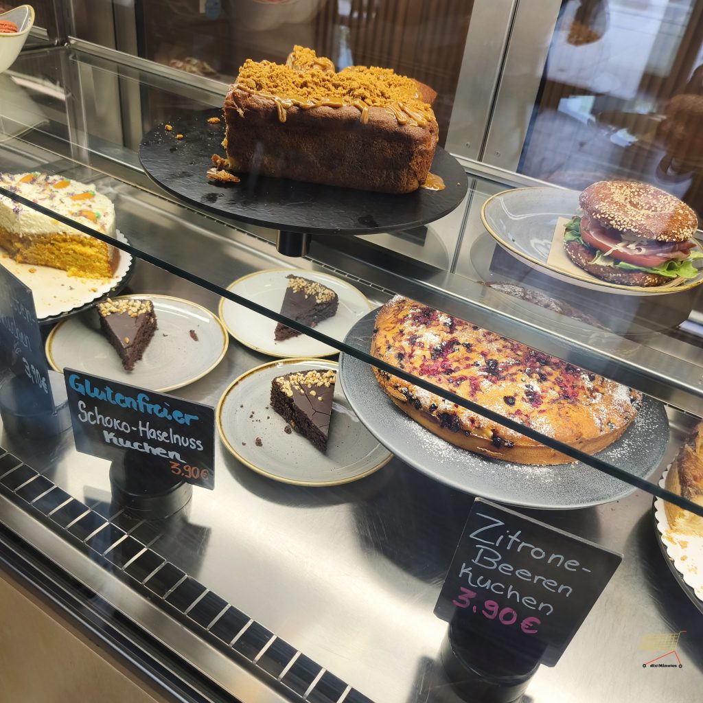 Karottenkuchen, glutenfreier Schoko-Haselnuss-Kuchen, Macarons in unterschiedlichen Farben und Geschmacksrichtungen, Zitronen-Beeren-Torte, Apfelkuchen, Nusskuchen mit Zimtguss und Crunch obendrauf. Croissants, herzhaft und süß gibt es, Bagels ebenfalls und Bananenbrot sowie eine Quinoacreme als Nachtisch. Neben dem Mittagstisch eine wirklich außerordentlich leckere Versuchung, die mir da entgegenlacht, halte ich mich jedoch fürs erste zurück. Trotzdem, gut zu wissen. Ich bleibe beim indischen Dahl zum Mittagessen. Gegen das Mitttagtief bestelle ich einen Cappuccino. Mein Löffel sticht durch die dicke Schicht Milchschaum. Lecker. Dann geht es zurück an die Arbeit, bin schließlich nicht zum Vergnügen da.