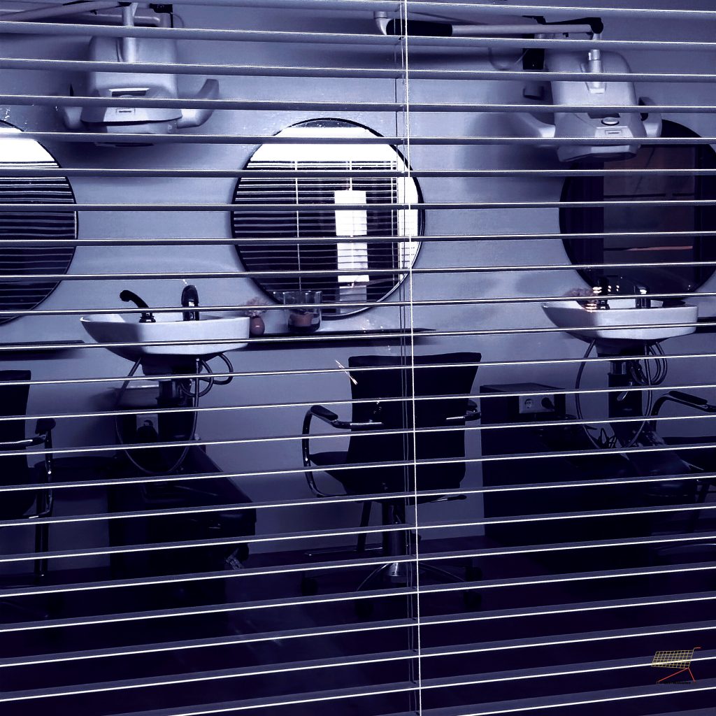 Geworfen von Straßenlaternen oder der Beleuchtung in Geschäften oder Büros, gefällt mir das Schattenspiel. Wie beim Frisörsalon. Der Kontrast zwischen Hell und Dunkel, dem Interieur in Verbindung mit den Lamellen der Jalousie, ist gut. Er zeigt die Arbeit in einem anderen Licht. Alles ist präpariert, wartet auf die nächsten Kunden, auf den nächsten Tag. Im Dornröschenschlaf.