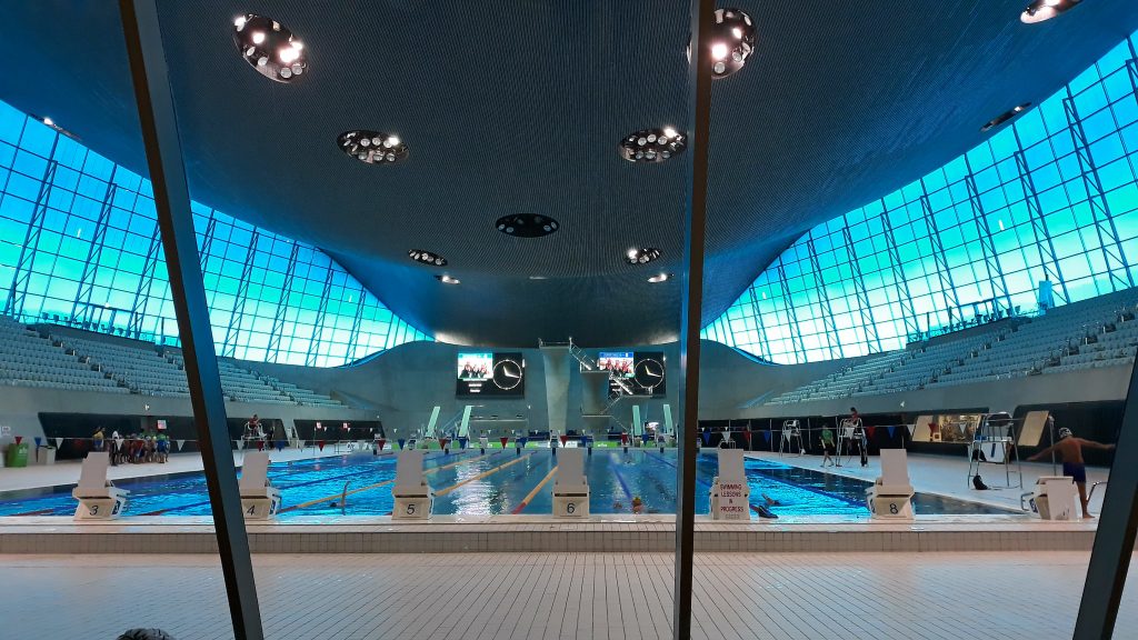 Nein, worauf ich eigentlich zu sprechen kommen möchte ist, dass beim Anblick des Aquatic Centres in London mir mein Besuch in selbigem wieder eingefallen ist. Vor ein paar Jahren waren wir bei unserem Städtetrip nach London auch im Aquatic Centre schwimmen. Kommt man mit den Eindrücken gewöhnlicher Schwimmbäder dort an, staunt man nicht schlecht ob der Ausdehnung des Wassers. Und nicht nur das – die ganze Anlage ist riesig. Selbst im normalen Badebetrieb saßen gleich mehrere Bademeister auf weiß lackierten Hochsitzen und wachten von dort übers Schwimmvolk. Ich erinnere mich gut an dieses unglaubliche Gefühl dort ins Wasser zu springen. Es war viel flutschiger – besser vermag ich es nicht zu beschreiben – als alles Wasser, in das ich bisher im Schwimmbadbereich meinen Zeh hineingesteckt habe. Einfach unbeschreiblich schön. Türkisblau und glitzernd und wohlig warm und tragend und schnell. Was für ein Glück, dort seine Bahnen zu ziehen.