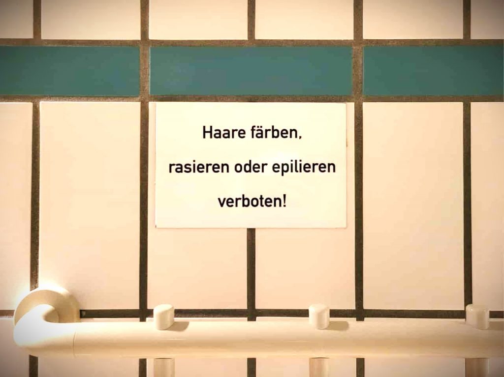 Noch besser ist der Gedanke ans epilieren. Ich stelle mir unabsichtlich vor, wie ich mir meinen brandneuen batteriebetriebenen Silk épil no. 3 unerschrocken durch den Schritt ziehe. Die Augen schmerzhaft verdreht versuche ich souverän unauffällig zu wirken, um keine unnötigen Blicke meiner Mitduscherinnen auf mich zu lenken. Gehe ich danach noch schwimmen? Im Angesicht des Chlorwassers wohl besser nicht. Nun denn, irgendeinen Grund muss es haben, dieses Schild. Pikanter Weise hängt es nicht in der Männerdusche – warum eigentlich? Scheint niemand bisher in den Sinn gekommen zu sein, dass auch Männer Körperpflege betreiben.