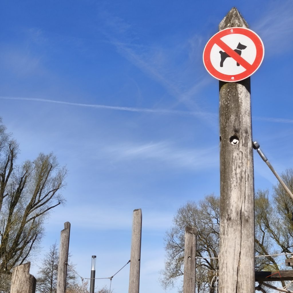 Wer, um Himmels Willen, befestigt ein Hunde-Verboten-Schild an der obersten Stelle des Klettergerüstes am Spielplatz? Das wirft direkt zahlreiche Fragen auf.