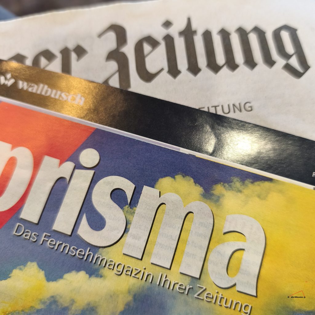 Aber noch etwas anderes gibt es hier: die Tageszeitung. Wie lang ist das her, dass ich die morgens aus dem Briefkasten zog? Lange. Ich blättere durch. Dabei fallen mir zuerst die Werbeblättchen in die Finger und die gute, alte Prisma mit dem Fernsehprogramm für die kommende Woche. Jetzt, zum langen Wochenende, wirbt der örtliche Möbelladen mit Angeboten und bei dem schönen Wetter gibt es Turnschuhe für Läufer:innen beim hiesigen Sportgeschäft.